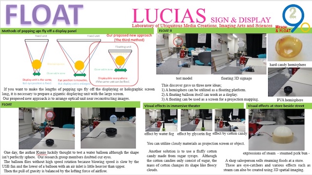 | The authors have proposed “flying 3D display units” as a new approach and researched floating 3D images which are in the room and above the corridor or the street. We show ‘FLOAT’ platform system using hemisphere and floating volumetric objects for projection mappings which are arranged and floating in the air. We will demonstrate four display units at I-Demo session. One is a flying ball screen for a projective display use or an advertisement use. The other is a hemisphere FLOAT platform for loading various optical elements or 3D balloon object. Moreover we show a miniature model for stage effect and eye-catchers for marketing using our proposed FLOAT platforms. | ||