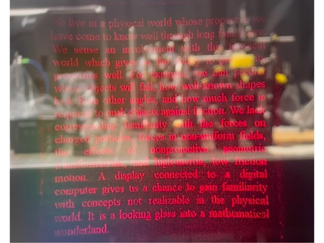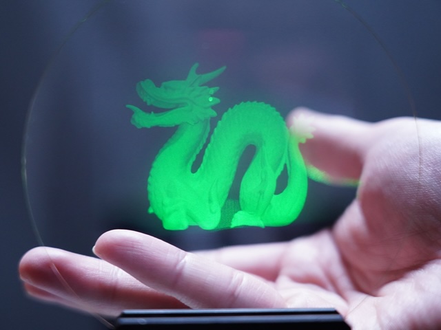 | We will demonstrate an innovative AR system that displays arbitrary still image using holography. This demo system consists of a laser light source and a hologram placed on the surface of a contact lens. When the laser light enters the hologram, the recorded image is projected. Since the image is displayed at a distance from the eye, users can focus on it even though the contact lens is positioned close to the eye. In the future, we plan to use electronic holograms to switch images and display videos. | ||