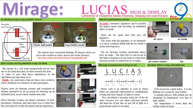 | The authors have researched floating 3D images which are above the corridor or street, and we hit on the question; Can ones notice what they haven’t recognized yet? We show methods to catch ones’ attentions using air blowing, smell delivery and air heating and cooling units in our ‘Mirage:’ aerial display system. We will demonstrate three display units at I-Demo session. One is ‘Mirage:’ display system that is the main part of an aerial display. The others are additional units for our proposed ‘Mirage:’ display unit. We will demonstrate and show eye-catching methods using air blow. Moreover we show smell delivery system for stimulating their appetites by smell from a viewpoint of marketing using same air blow system. | ||