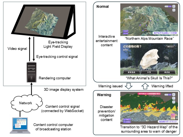 | We present a content control system for eye-tracking light field displays, designed to support dynamic and context-aware 3D visualization. Content switching is achieved by applying remote control to a download-based architecture with local rendering, which is considered a promising approach for future deployment. The demonstration includes two entertainment scenarios and one emergency response application, highlighting the system’s adaptability. While users are engaged with entertainment content, the broadcasting station can seamlessly override it with urgent alerts. This approach enhances the practicality of light field displays in public and personal environments, offering both immersive experiences and responsive communication capabilities. | ||