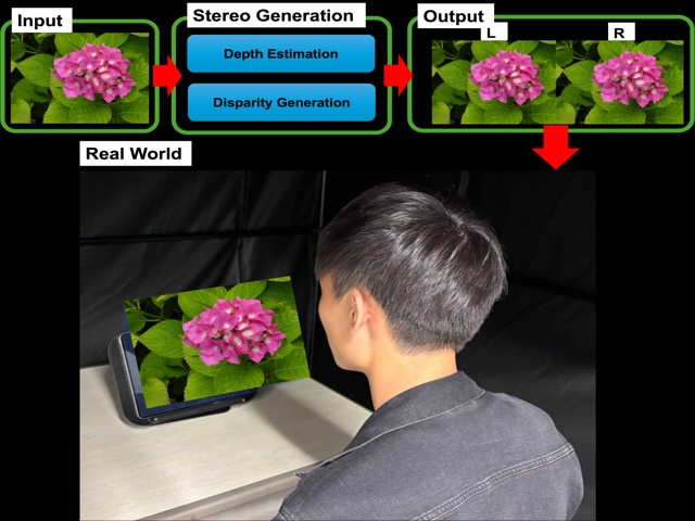 | We have developed a technology that automatically generates high-quality 3D stereo images from 2D video. The automatic generation technique estimates depth from the 2D video and warps the video based on the estimated depth. It then inpaints missing parts of the generated 3D stereo images using a diffusion model. This demonstration displays the 3D stereo images generated by the proposed method on a tablet-sized autostereoscopic 3D display. The exhibition allows comparison between the original 2D video and the generated 3D stereo images. | ||