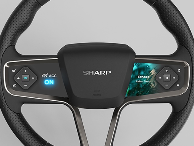 | The 5.5 inch prototype using high-sensitive force touch sensor is novel steering wheel with on-screen buttons. Our proposed technology "Click Display" is a display with a click-like operation feeling and uses three technologies, a highly sensitive force touch sensor, 3D shape cover and haptic feedback in combination with a display. Combined with the novel GUI, a single control button on the screen enables to perform multiple functions such as audio, map, light, adaptive cruise control and others. By replacing conventional buttons with our on-screen multi-functional button, many mechanical control buttons can be reduced. Furthermore, our prototype enables advanced designs. | ||