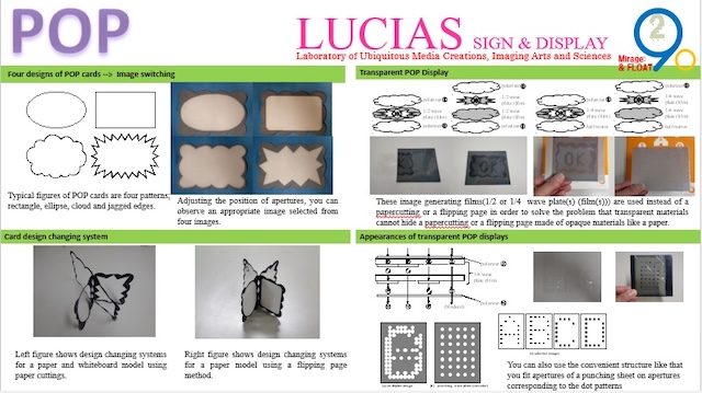 | POP cards are useful for eye catchings of customers but they are not reusable because of nonrecyclable design. The authors have researched variable imaging board system for reproducting various shapes. We show variable transparent POP display using a polarization control technique and coloring technology. We will demonstrate two types of POP display units (opaque and transparent board), image switching technologies, color generating technologies and polarization control techniques and at I-Demo session. If visual effects using an aerial signage unit and smell displaying technology will be embedded, our proposed POP display would be more useful in the future. | ||