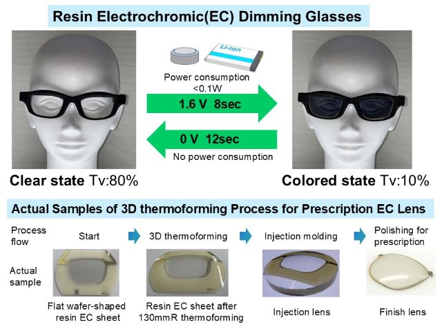 | We have realized Electrochromic (EC) sheet for prescription glasses which is the world's first resin EC consumer device. EC glasses can freely dim according to the surrounding brightness and situation. The developed EC sheet has high transmittance, wide dynamic range, low power consumption, safety and light weight and so on. We will exhibit 1) actual working durable resin EC glasses and 2) actual samples of 3D thermoforming process for prescription EC lens. You can wear the actual EC glasses and experience the speed of EC coloring / decoloring according to the light / dark adaptation of your eyes. | ||