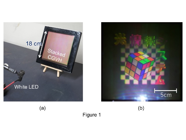 | We will demonstrate a full-color full-parallax deep 3D image reconstructed by stacking three computer-generated volume hologram (CGVH) with a size of 18cm×18cm (Fig.1(a)). The CGVHs are fabricated by tiling contact-copy, where three computer-generated holograms (CGH) printed using laser lithography are transferred to photopolymers using an 8 × 8 tiling process. Each master CGH is composed of more than 100 billion pixels and provides a viewing angle of over 33°. High-quality full-color 3D images are clearly observed by white LED illumination with strong sensation of depth without any boundary of tiles (Fig.1(b)). | ||