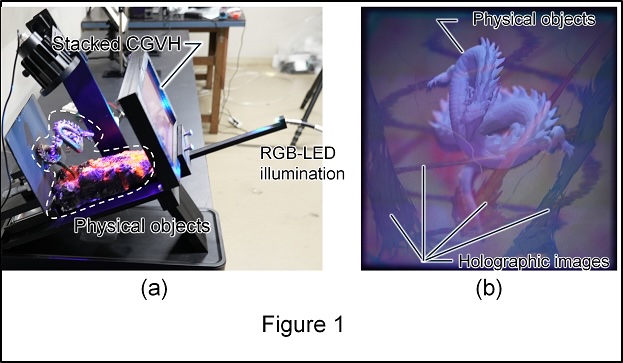 | We will demonstrate a holographic AR effect (HARE) display, where three transparent computer-generated volume holograms (CGVH) placed in front of the physical object generate full-color 3D images around the object (Fig.1(a)). Each CGVH having a size of over 10cm×10cm is created from a full-parallax computer-generated hologram (CGH) with approximately 34 billion pixels. Because the CGVHs produce not only parallax but also accurate focus adjustment, viewers can see color 3D images blended with physical objects seamlessly (Fig.1(b)). In addition, HARE produced behind the physical object is natural because of proper occlusion processing. | ||
