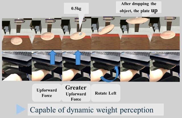 | We will demonstrate a system that allows users to perceive weight changes when lifting and dropping objects in VR space. The demo system is structured as a force input-visual presentation position output system. Users apply force from their palms to load cells to lift and drop objects, and the system uses sensor values to control the movement of the hand object in the VR space. The images are then output to a monitor, allowing users to perceive the weight. In this way, users can experience dynamic changes in weight in real time. | ||