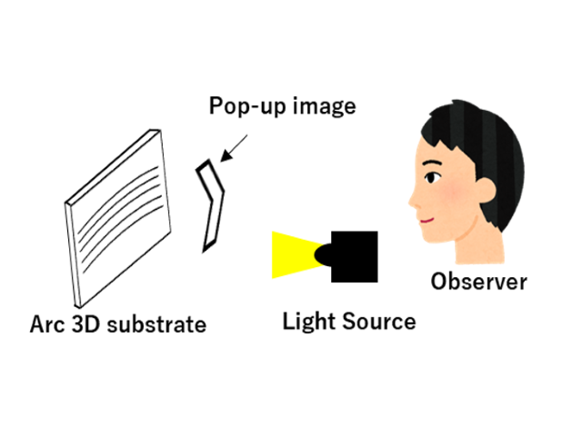 | We demonstrate a meter-scale popping-up image using the Arc 3D display and how the distance of the popping-up image change as the angle of the substrate change. The figure shows an overview of the Arc 3D display, in which a single light source illuminates a clear substrate with arc-shaped scratches to generate a popping-up image. This 3D display with long popping-up distance is expected to be used as a directional sign on an expressway, where a number of the sign boards are installed, and then their cost can be reduced. | ||