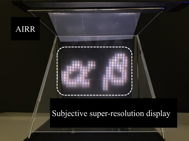 | This is a demonstration of an aerial display with subjective super-resolution method. This method switches sub-frames generated from the original image at high-speed, and the observer perceives a higher resolution than actual resolution of the display. As shown in the figure, our device forms subjective super-resolution display in the air, by using AIRR (aerial imaging by retro-reflection). Aerial image makes the non-light emitting pixels unnoticeable and improves the apparent resolution. The high-resolution display can be achieved with a small number of pixels, which reduces the number of pixels on the LED panel and thus reduces the cost of the display. | ||