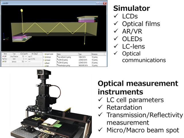 | Shintech offers design simulator and measurement instruments for LC cells, optical films, periodic structures, and others. The simulator gives clues for development and improvement. In addition, it can do structural optimization. The measurement machines determine the LC cell parameters and optical anisotropy of your prototypes or product devices. Our solutions accelerate your research, development, manufacture, and your business. Application areas: LCD, OLED, VR, AR, Optical communications |