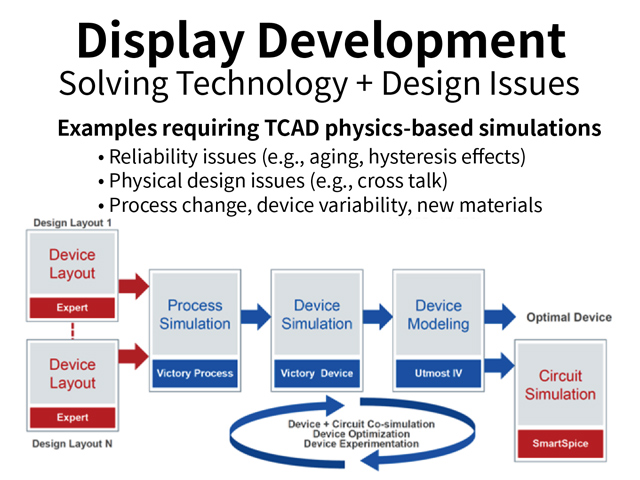| Silvaco's display development solution enables designers to develop displays from the pixel level device to a complete manufacturing ready design. Silvaco's display development solutions are in production use with industry leading display panel providers worldwide. Utilizing proprietary built-in functions custom-tailored for display device and circuit design, our solution enables display designers to create, model, and simulate physical devices at the device level with TCAD. For display circuit design, our solution delivers a high-performance design environment including schematic capture, circuit layout and simulation, and physical verification. |