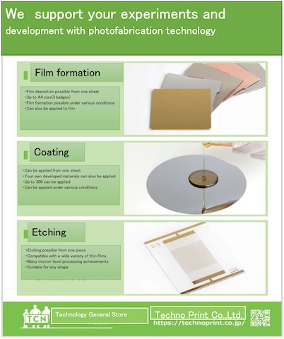 | We manufacture and sell evaluation boards for displays (LCD, OLED etc.), peripheral materials, and equipment using photolithography and etching technology. We also support the development of various materials through prototype (1 sheet~) ~ patterning processing until mass production, prototype production before mass production, etc., so please feel free to contact us. | ![]() |