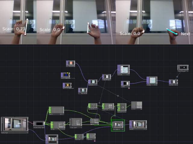 | Spatial Augmented Reality (SAR) aims to seamlessly integrate physical and cyber spaces using projection technology, eliminating the need for head-mounted displays. While proposed in 1998, SAR realization became feasible following the open-sourcing of Google MediaPipe in 2019. This research develops a new technique for constructing highly responsive interactive projection mapping by integrating TouchDesigner, and Google MediaPipe. The system utilizes MediaPipe to stream hand coordinate data to TouchDesigner, where it is converted into control signals. Successful interaction was demonstrated: the normalized length between the left hand's thumb and index finger controls dynamic pattern scaling, alongside image modification via right-hand gestures. | ||