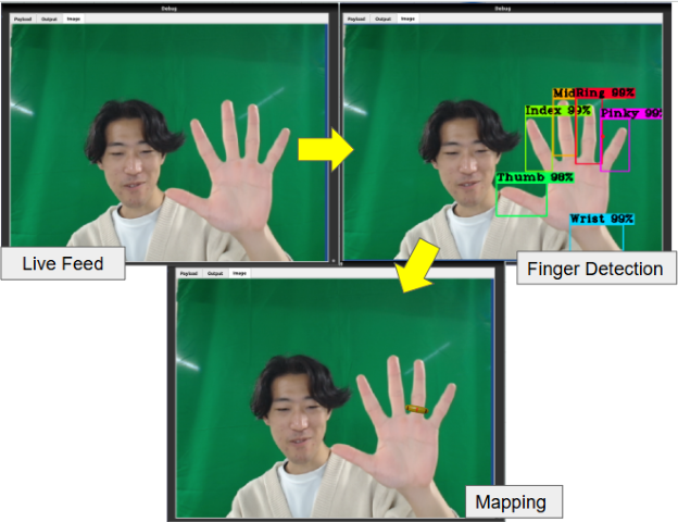 | We are going to demonstrate a system using AI that detects fingers in a live feed and overlays a ring onto a finger. This system uses image recognition algorithms on video taken by a webcam and detects any visible fingers. Afterwards, a 3D model of a ring is mapped to the appropriate position on a specific finger. As the hand and fingers move, the system will track the movement of the finger and continue to map the ring to the finger alongside its movements. By using this system, users can confirm their compatibility with the ring. | ||